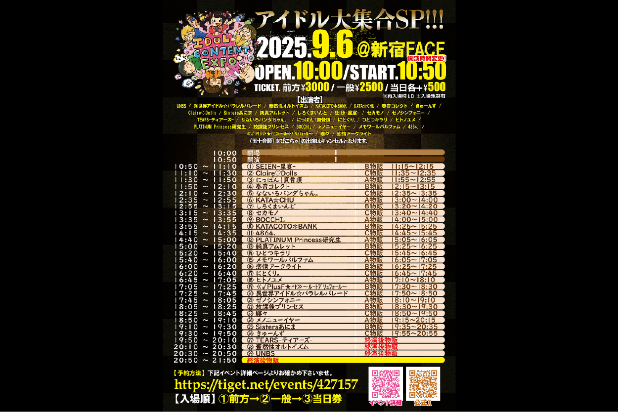 SCHEDULE 2024 01 02 03 04 05 06 07 08 09 10 11 12 2026 2025.09 2025. 10 October 2025. 08 August September 06Sat IDOL CONTENT EXPO @新宿FACE アイドル大集合SP!!! OPEN/START 10:00 / 10:50 PRICE 前方 3,000円 一般 2,500円 当日各+500円 LINE UP OFFICIAL SITE IDOL CONTENT EXPO TICKET ■TIGET INFO お問い合わせはこちら NOTE 別途1ドリンク代600円