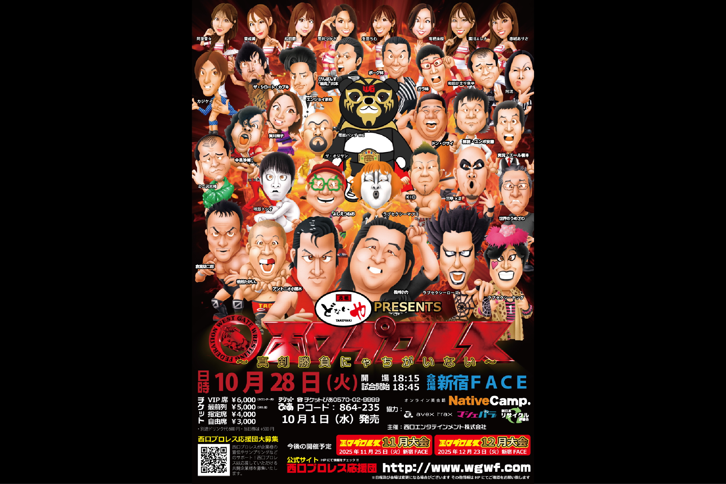 SCHEDULE 2024 01 02 03 04 05 06 07 08 09 10 11 12 2026 2025.10 2025. 11 November 2025. 09 September October 28Tue 西口プロレス 元祖 どないや PRESENTS 西口プロレス ~真剣勝負にゃちがいない~ OPEN/START 18:15 / 18:45 PRICE VIP席 6,000円 最前列席 5,000円 指定席 4,000円 自由席 3,000円 (当日券は+500円) LINE UP OFFICIAL SITE 西口プロレス TICKET ■チケットぴあ[Pコード:864-235] ■西口プロレス事務局 [TEL] 03-6416-0218 ■各選手まで INFO 西口プロレス事務局 [TEL] 03-6416-0218 NOTE 別途1ドリンク代600円
