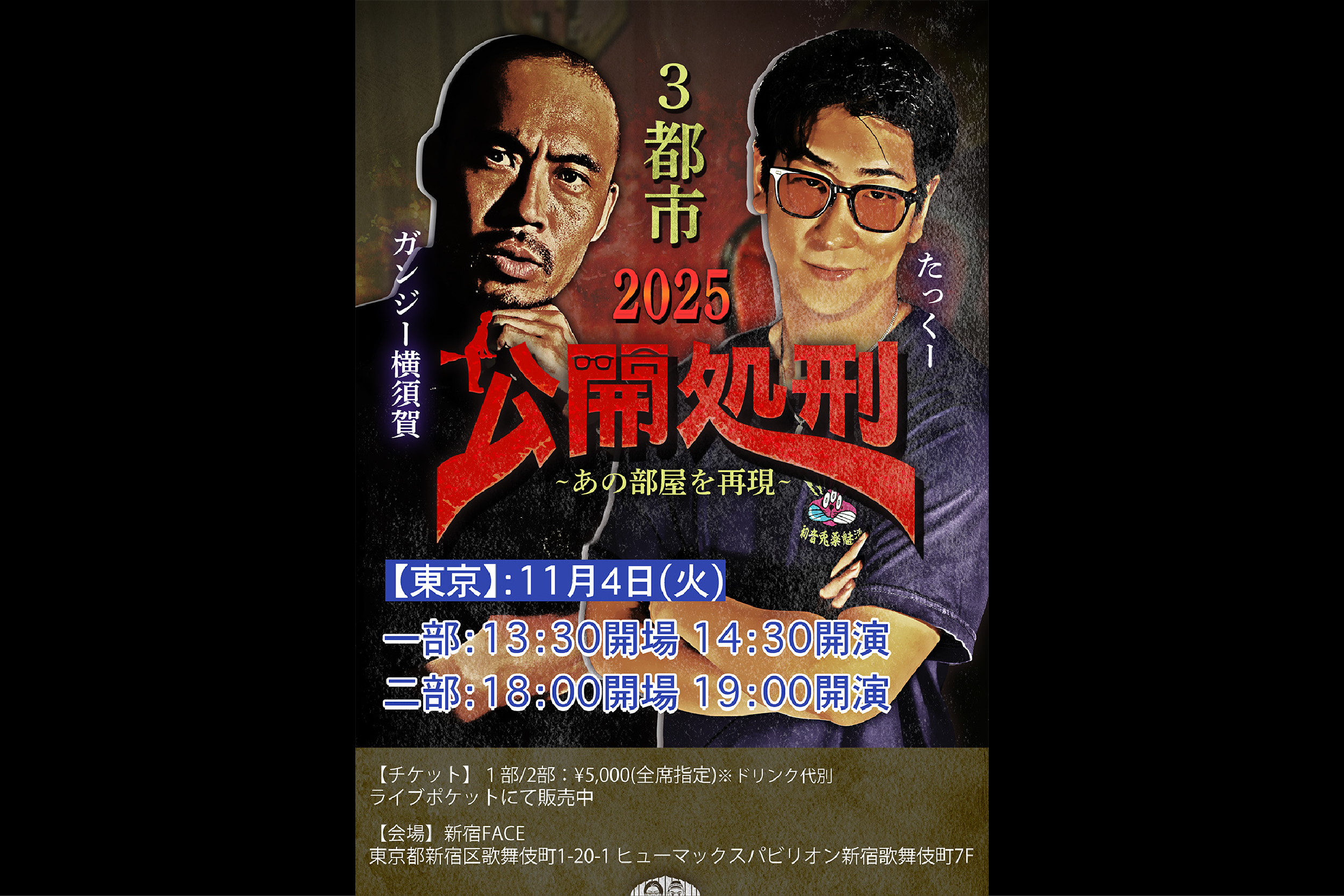 SCHEDULE 2024 01 02 03 04 05 06 07 08 09 10 11 12 2026 2025.11 2025. 12 December 2025. 10 October November 04Tue 澤村拓亨 / ガンジー横須賀 公開処刑2025~あの部屋を再現~東京公演【2部】 OPEN/START 18:00 / 19:00 PRICE 全席指定 5,000円 LINE UP 澤村拓亨 / ガンジー横須賀 TICKET ■LivePocket INFO 公開処刑2025運営委員会 NOTE 別途1ドリンク代600円
