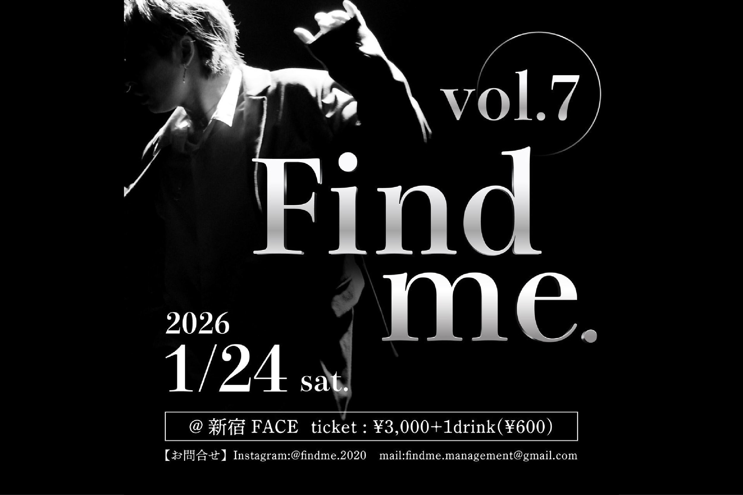SCHEDULE 2025 01 02 03 04 05 06 07 08 09 10 11 12 2027 2026.01 2026. 02 February 2025. 12 December January 24Sat Find me.vol.7【昼の部】 OPEN/START 15:00 / 15:30 PRICE ticket 3,000円 LINE UP OFFICIAL SITE Find me. TICKET INFO お問い合わせはこちら NOTE 別途1ドリンク代600円