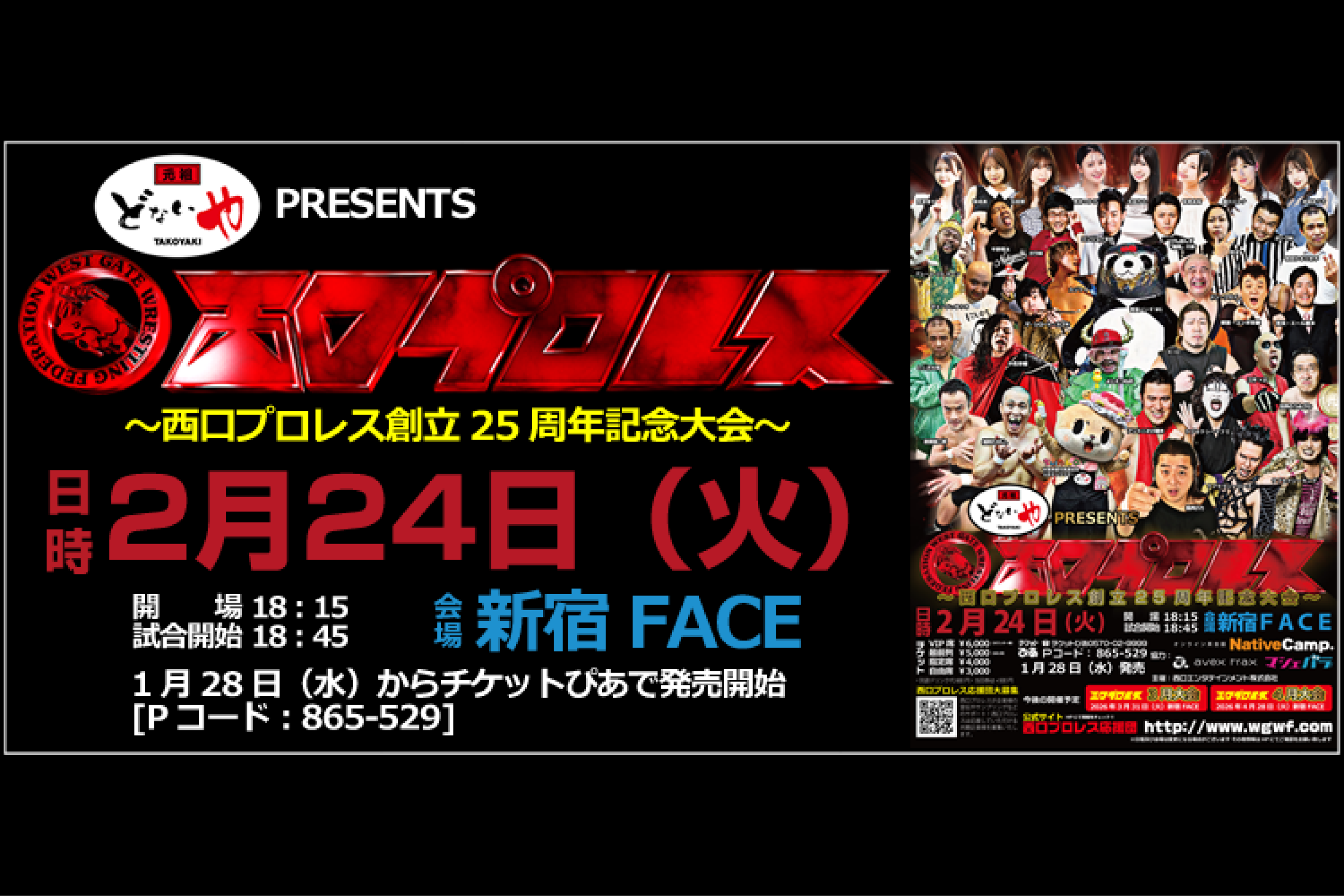 SCHEDULE 2025 01 02 03 04 05 06 07 08 09 10 11 12 2027 2026.02 2026. 03 March 2026. 01 January February 24Tue 西口プロレス 西口プロレス2月大会~西口プロレス創立25周年記念大会~ OPEN/START 18:15 / 18:45 PRICE VIP席 6,000円 最前列席 5,000円 指定席 4,000円 自由席 3,000円 (当日券は+500円) LINE UP OFFICIAL SITE 西口プロレス TICKET ■チケットぴあ[Pコード:865-529] ■西口プロレス事務局 [TEL] 03-6416-0218 ■各選手まで INFO 西口プロレス事務局 [TEL] 03-6416-0218 NOTE 別途1ドリンク代600円