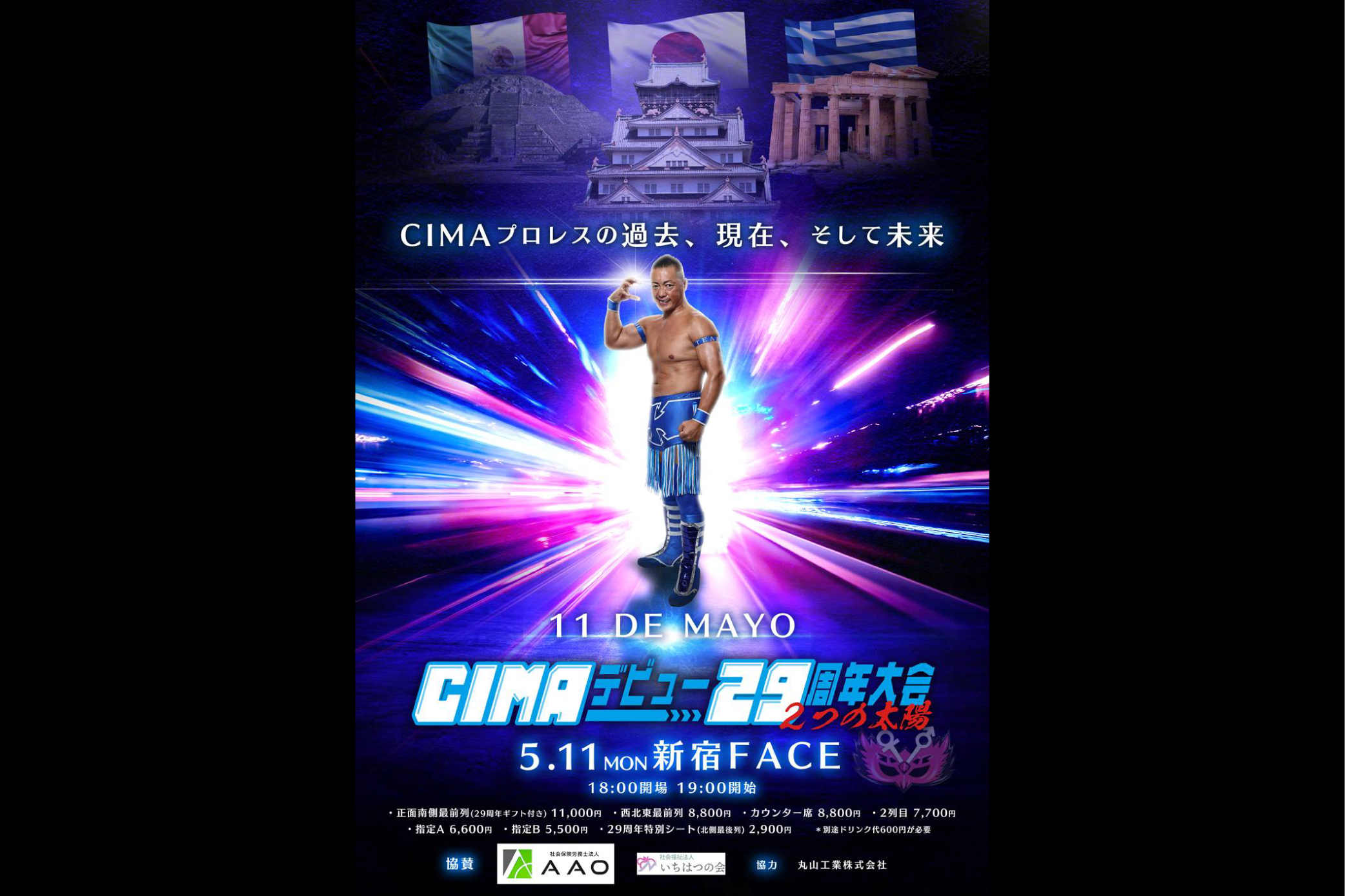 SCHEDULE 2025 01 02 03 04 05 06 07 08 09 10 11 12 2027 2026.05 2026. 06 June 2026. 04 April May 11Mon CIMA デビュー29周年大会2つの太陽 OPEN/START 18:00 / 19:00 PRICE 正面最前列(南側) 11,000円 最前列(北西東側) 8,800円 カウンター 8,800円 2列目 7,700円 指定A席 6,600円 指定B席 5,500円 29周年応援シート 2,900円 LINE UP OFFICIAL SITE CIMA TICKET ■チケットペイ INFO NOTE 別途1ドリンク代600円