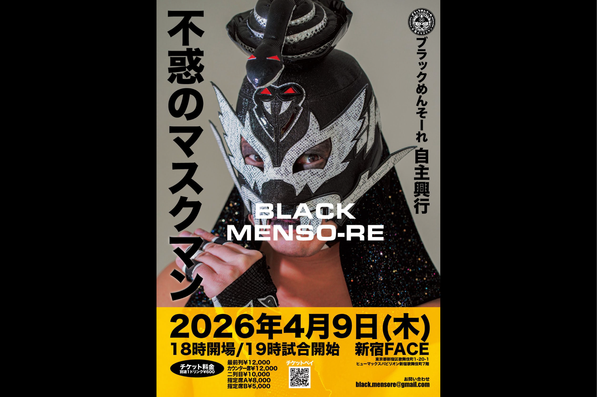 SCHEDULE 2025 01 02 03 04 05 06 07 08 09 10 11 12 2027 2026.04 2026. 05 May 2026. 03 March April 09Thu ブラックめんそーれ自主興行 『不惑のマスクマン』 OPEN/START 18:00 / 19:00 PRICE 最前列席 12,000円 カウンター席 12,000円 二列目 10,000円 指定席A 8,000円 指定席B 5,000円 LINE UP OFFICIAL SITE ブラックめんそーれ TICKET ■チケットペイ INFO NOTE 別途1ドリンク代600円